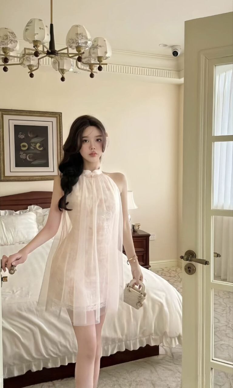 J951 NZ新中式名媛风重工亮片蕾丝拼接蝴蝶旗袍挂脖连衣裙