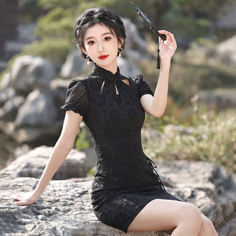 QP009 新中式黑色提花泡泡袖旗袍连衣裙