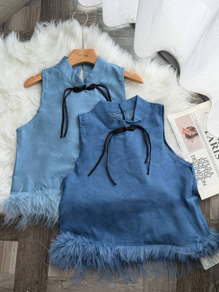 Y958 新中式盘扣毛毛设计无袖牛仔旗袍上衣