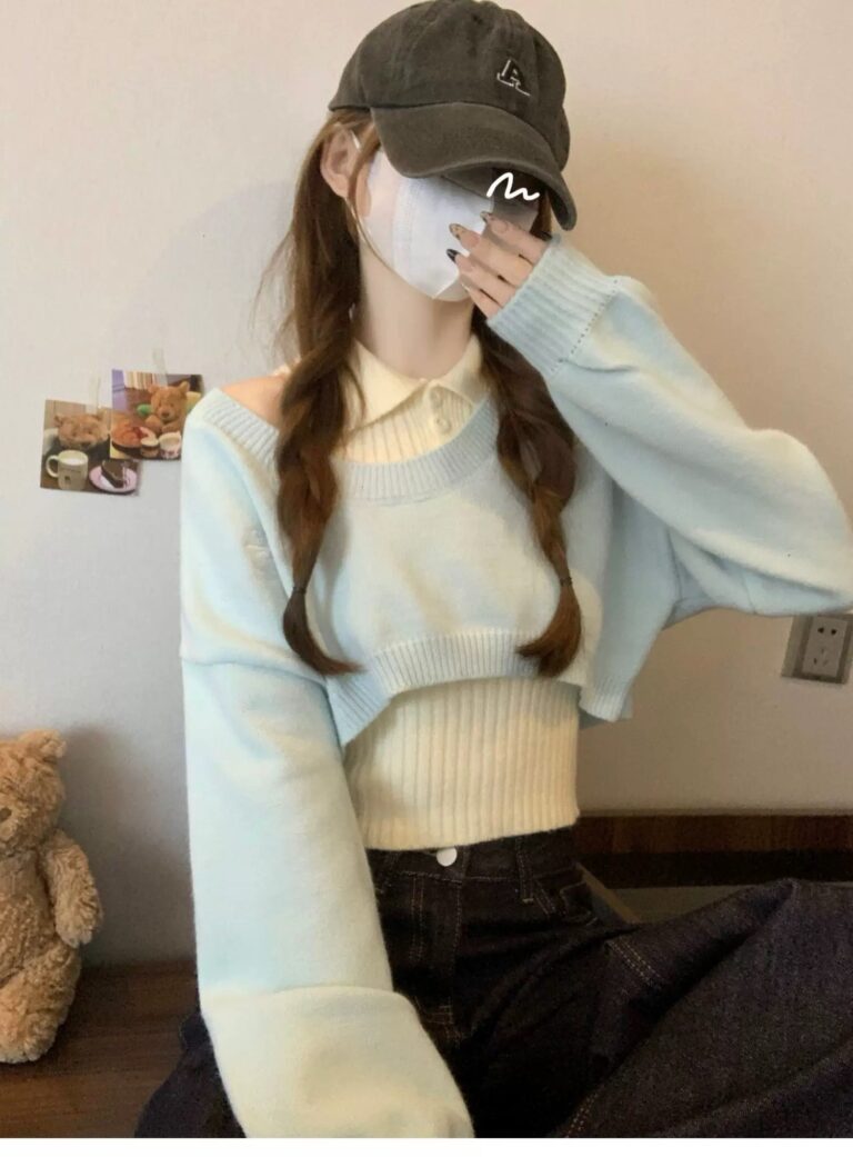B094 针织POLO领无袖上衣+针织长袖两件套套装