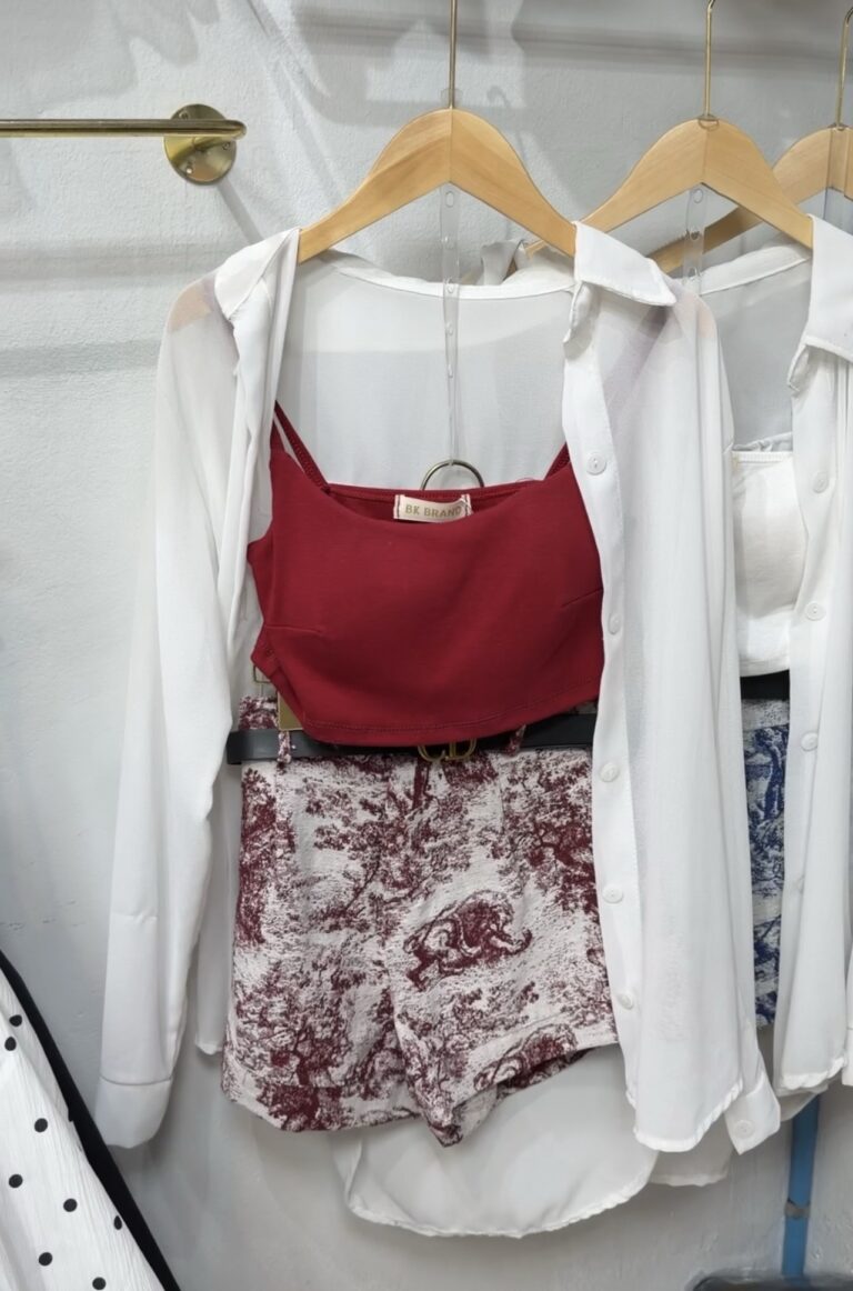 B104 CD吊带上衣+水墨风短裤+雪纺外套三件套