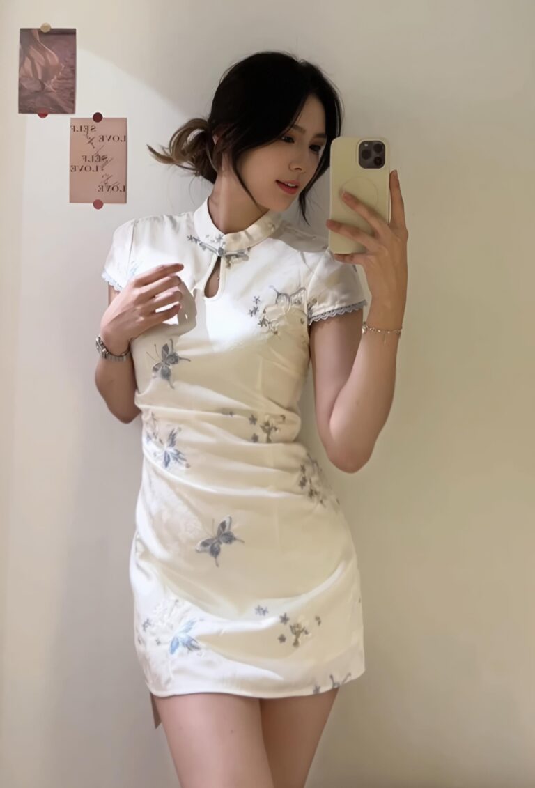 QP002 新中式青花瓷盘扣压褶短袖旗袍连衣裙