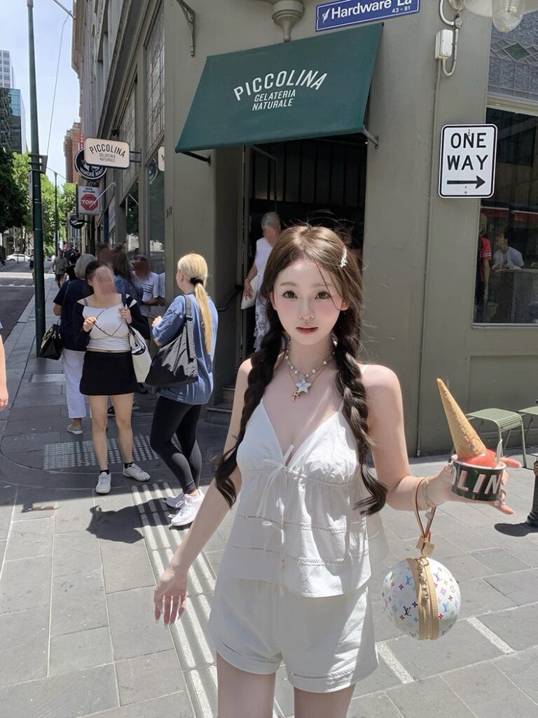 B860 纯欲风V领蝴蝶结露背宽松吊带上衣+短裤套装