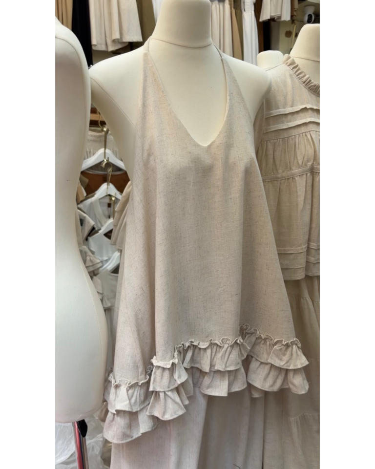 B834 棉麻V领荷叶边下摆挂脖露背上衣