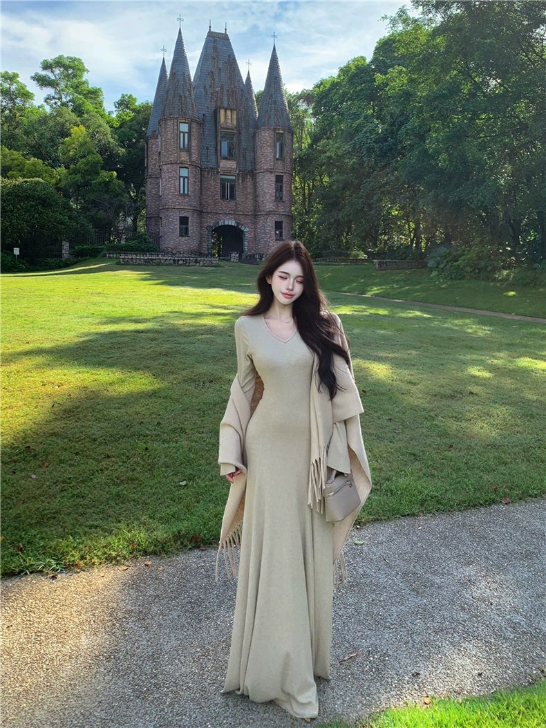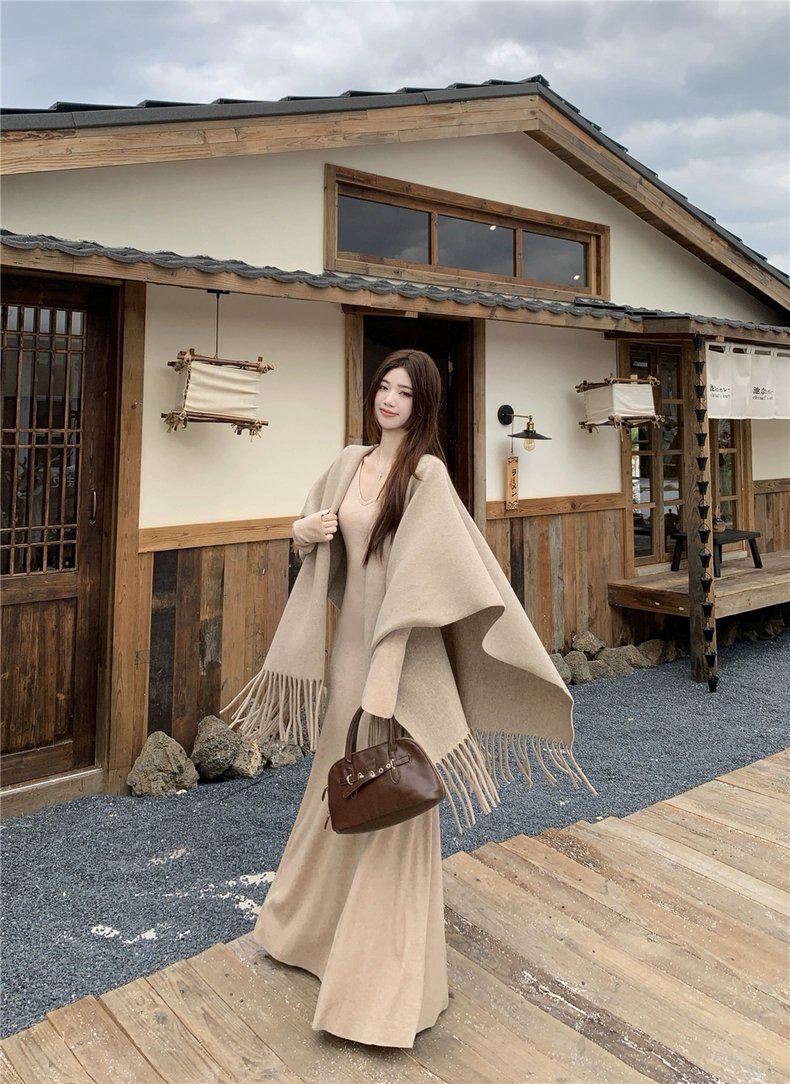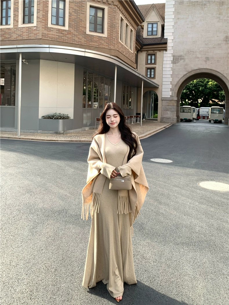 J1008 秋季高级慵懒风流苏斗篷+长袖连身裙两件套