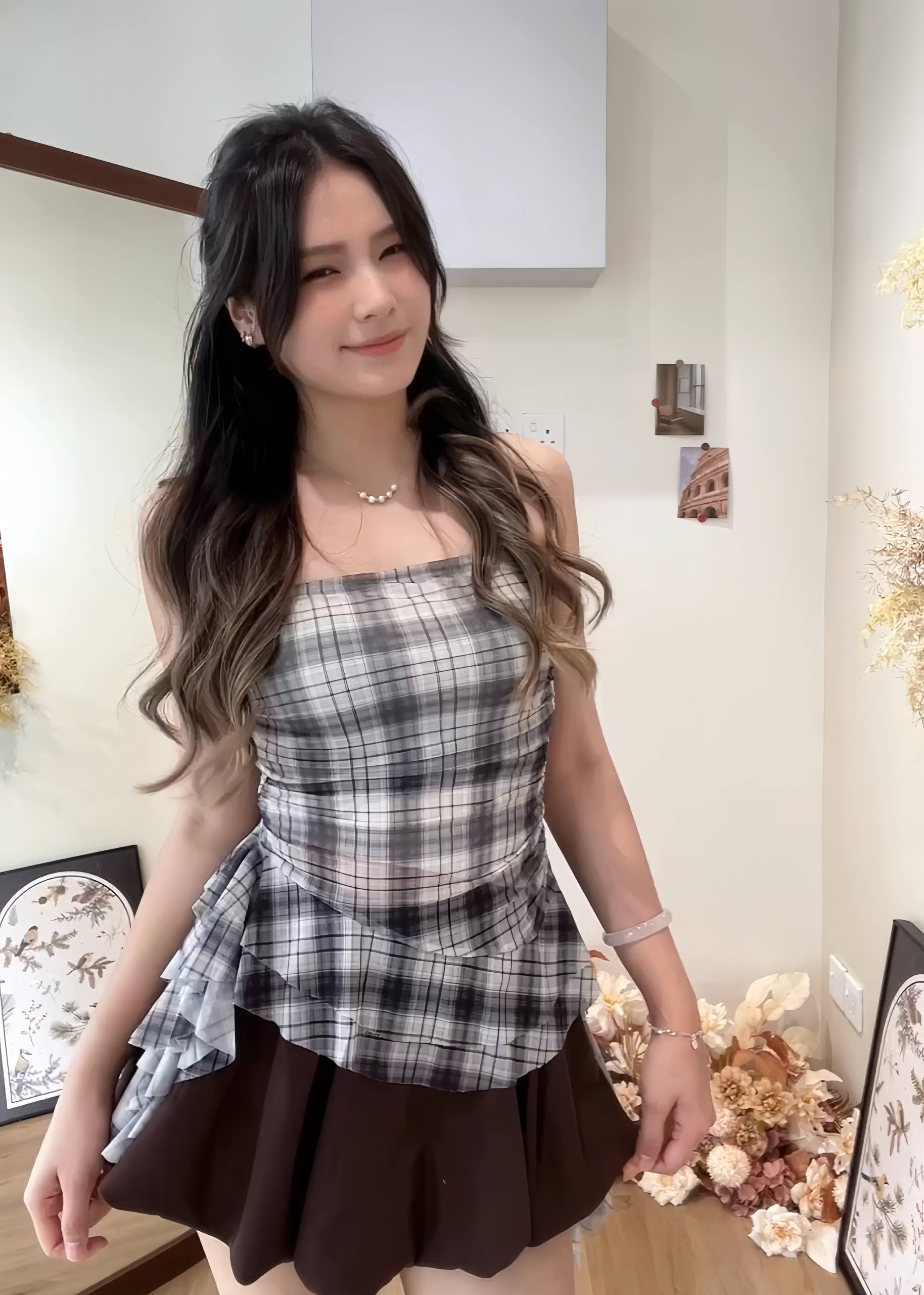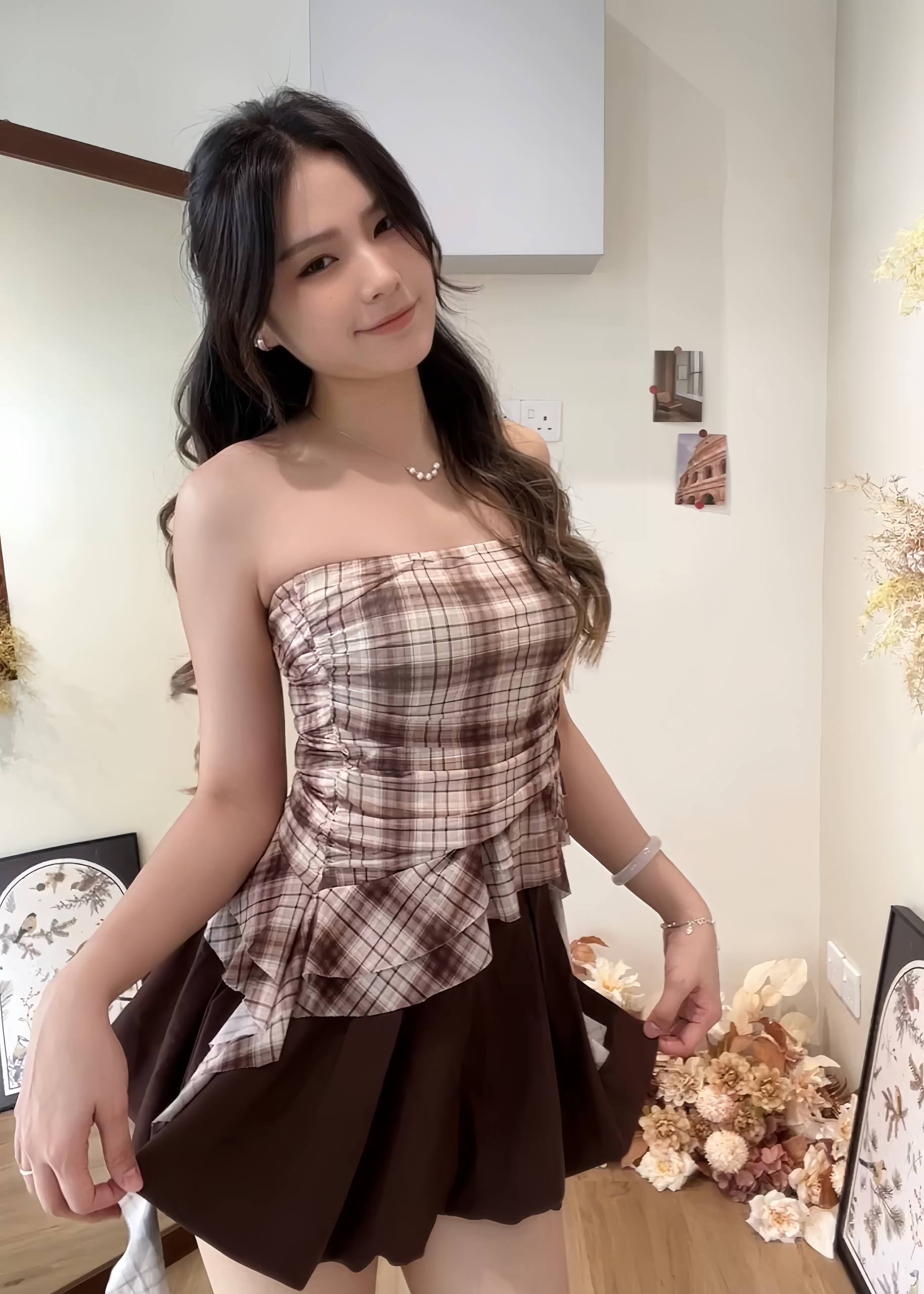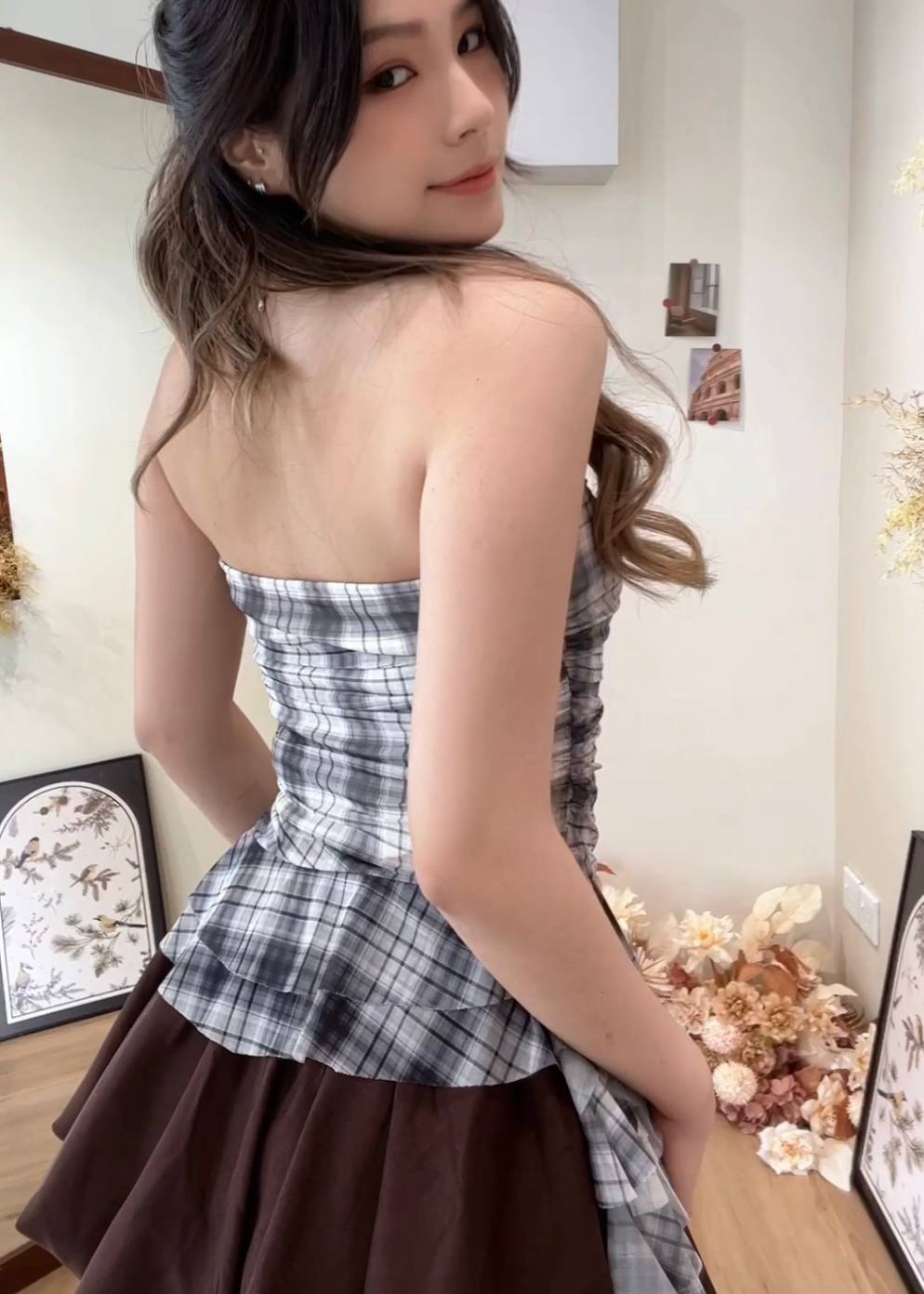 J1102 美式辣妹格纹不规则飘带抹胸上衣