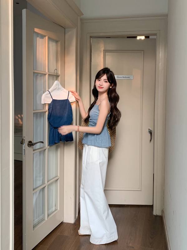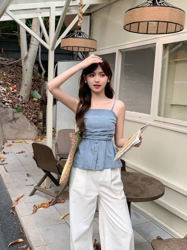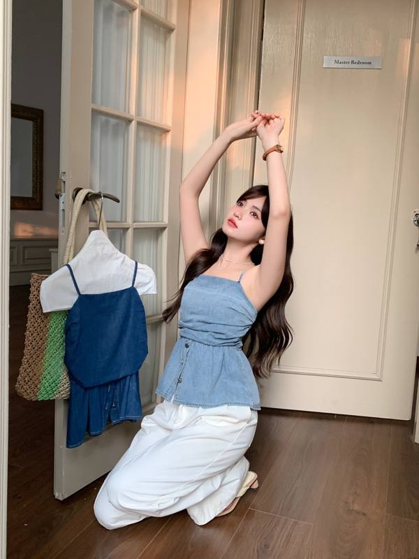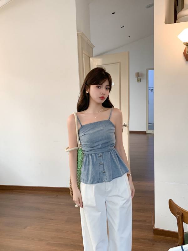 J923 复古褶皱软牛仔抹胸吊带上衣
