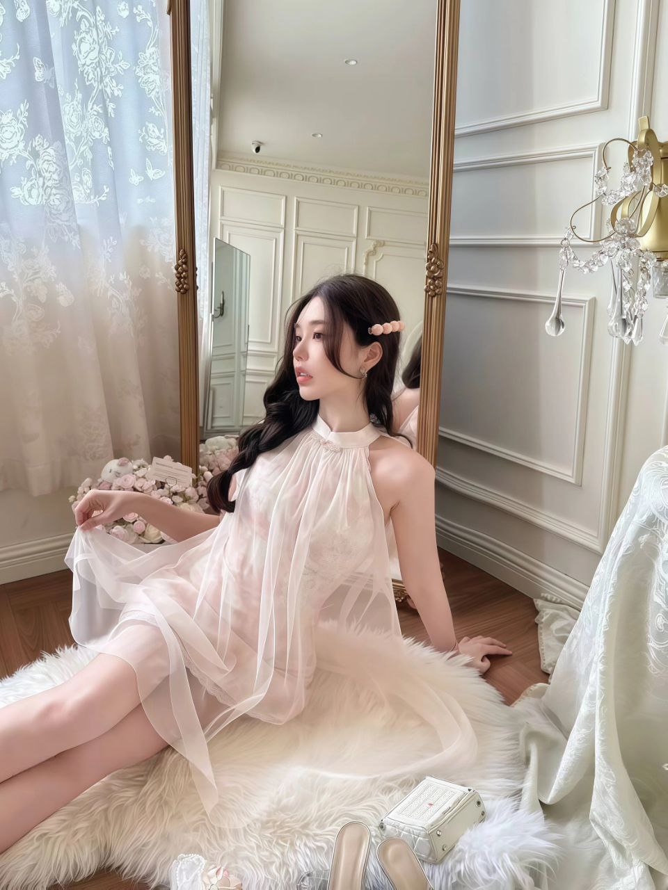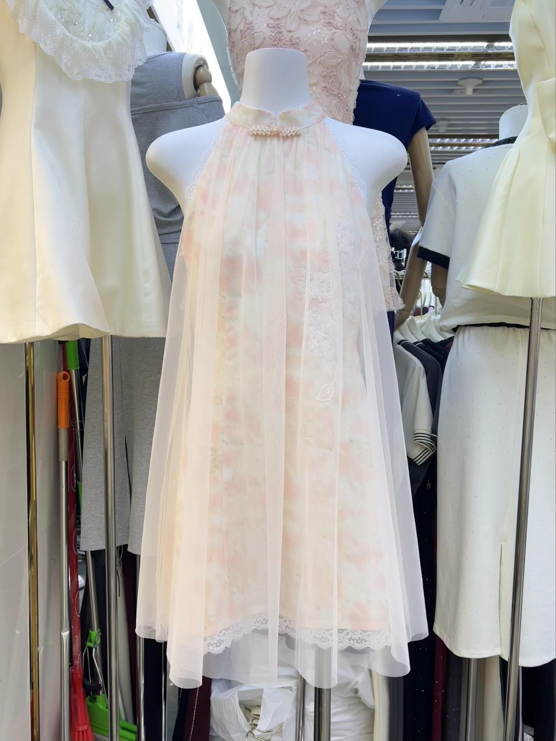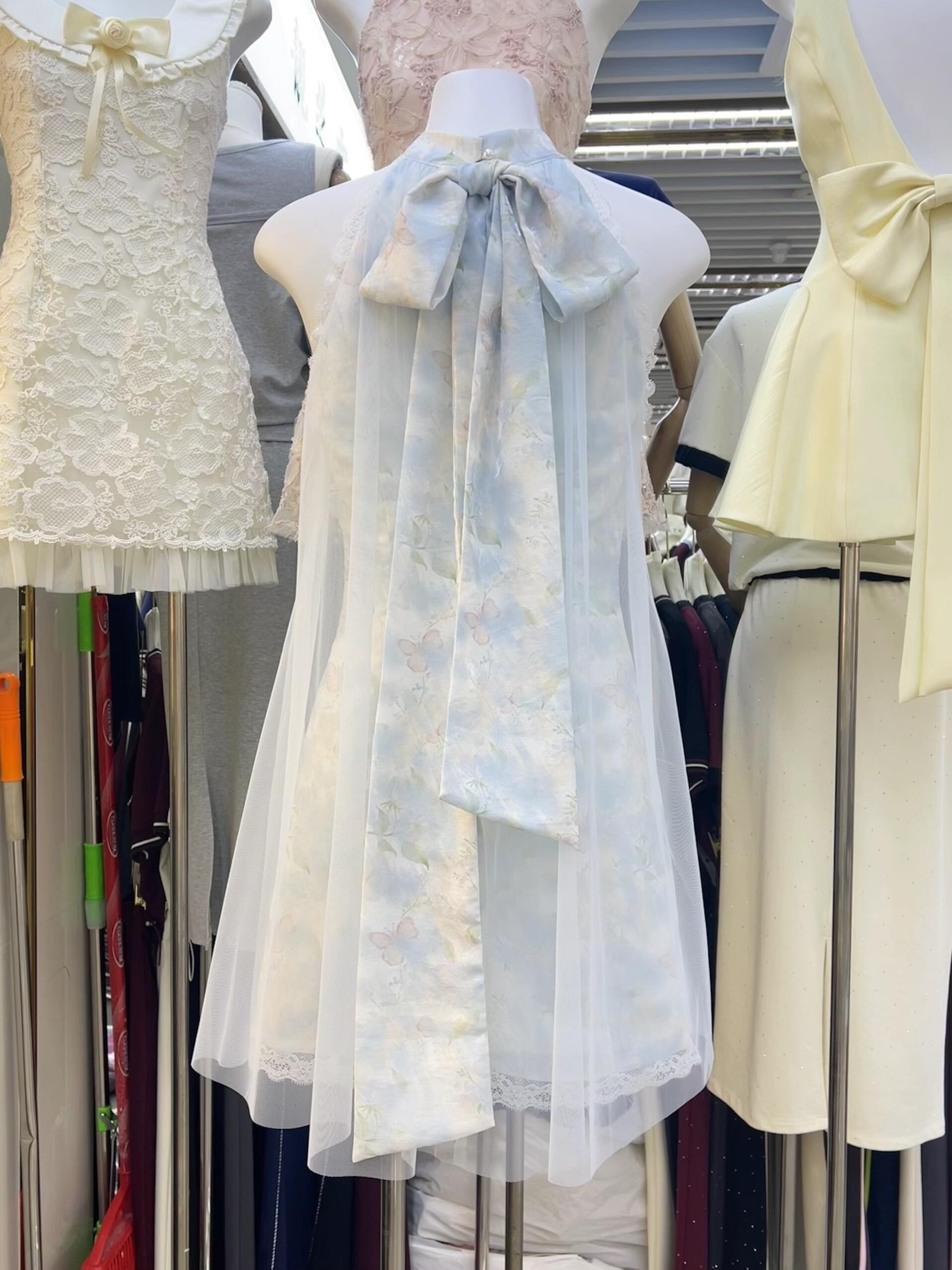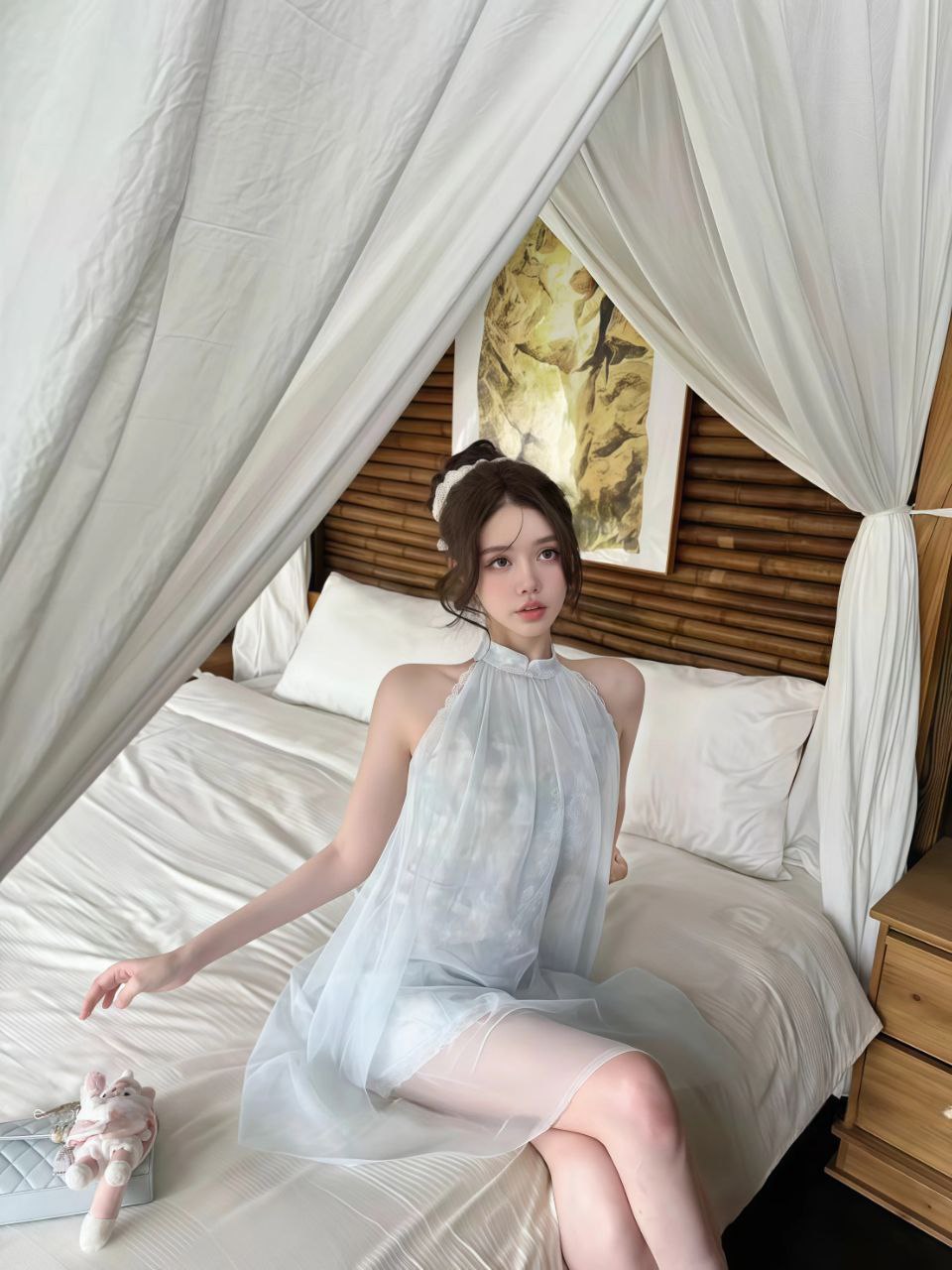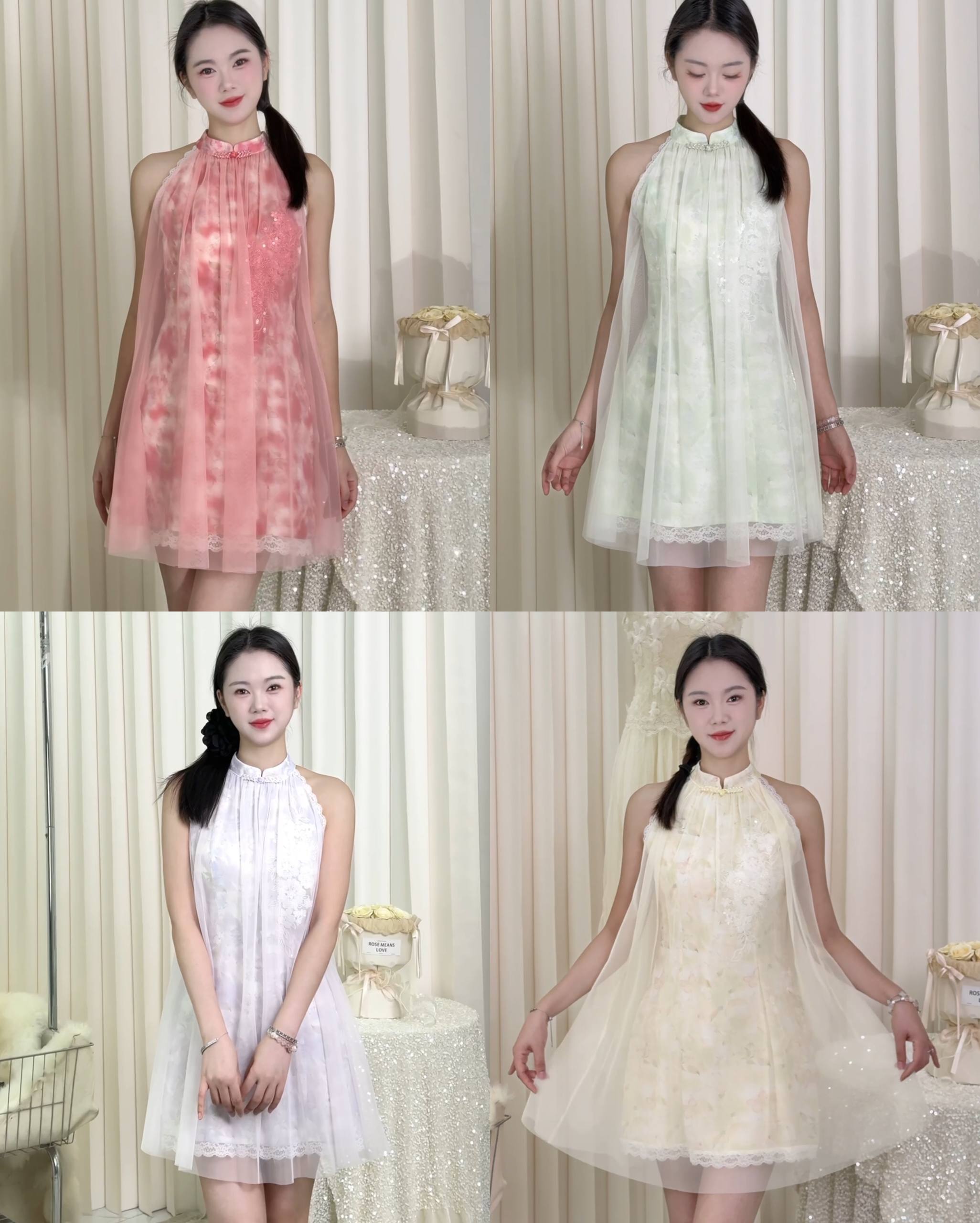 J951 NZ新中式名媛风重工亮片蕾丝拼接蝴蝶旗袍挂脖连衣裙