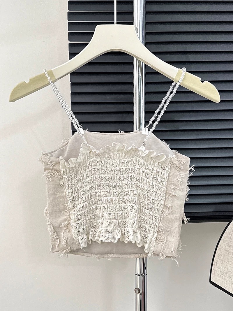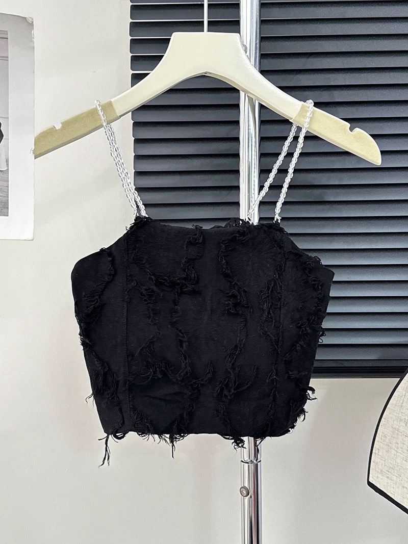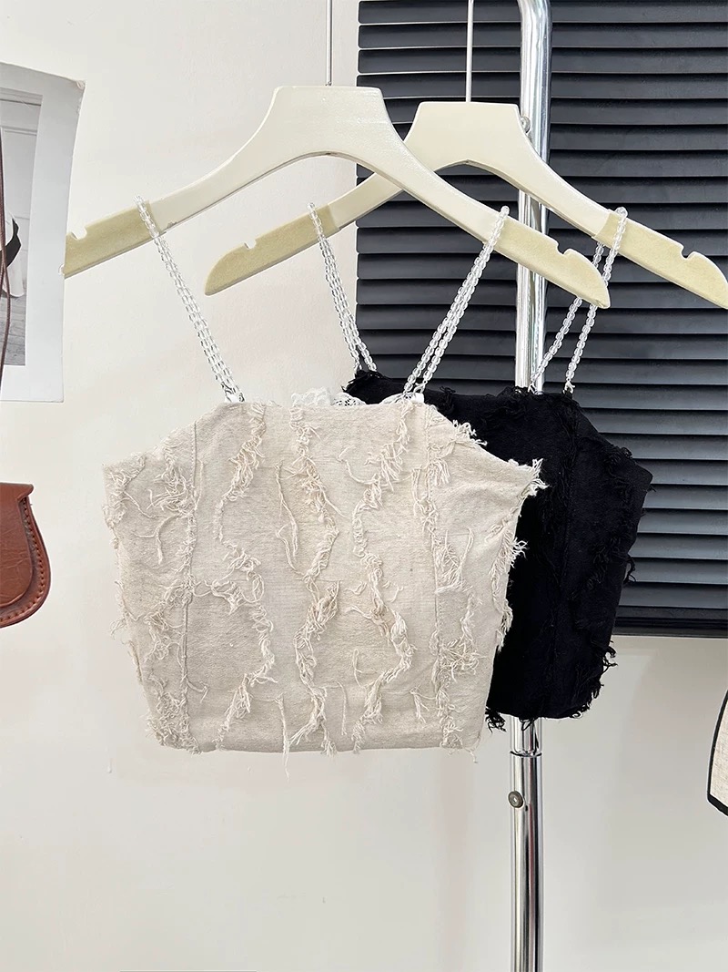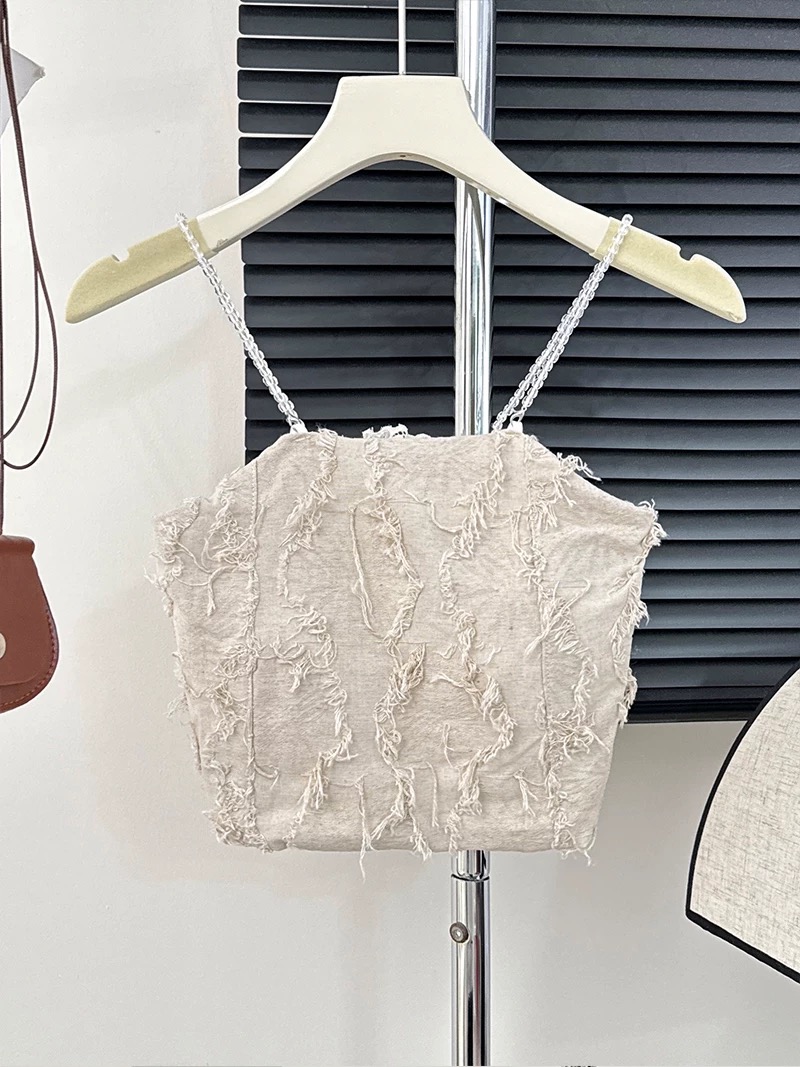 这款吊带有精致的流苏设计,剪裁简约优雅,适合搭配高腰裙、牛仔裤,日常出街或休闲聚会都很适合哦!