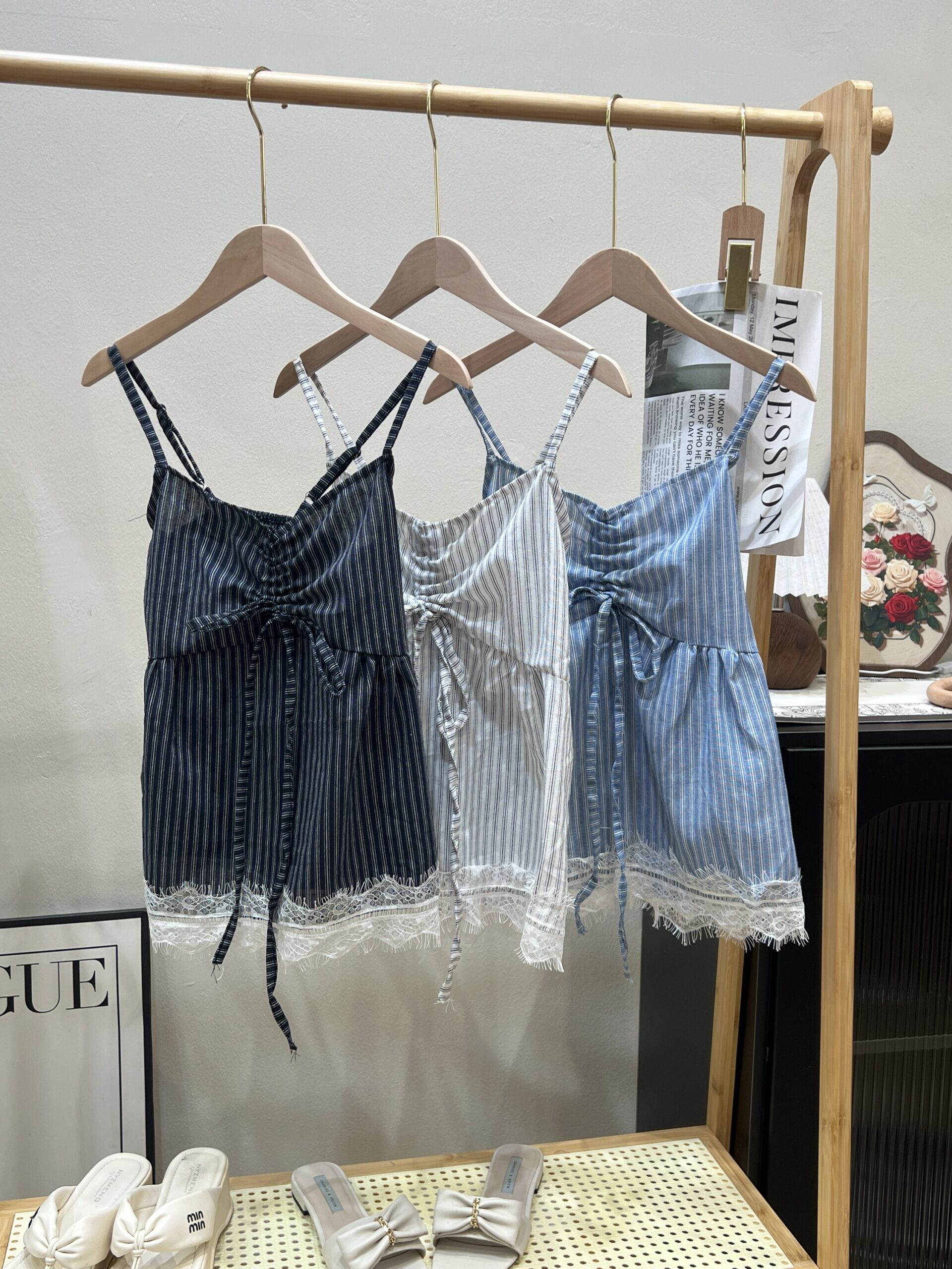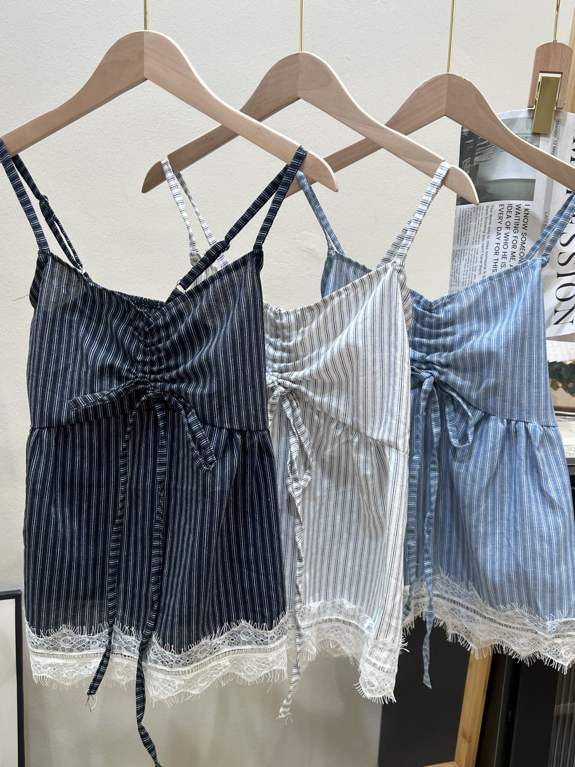 W013 线条抽绳设计蕾丝花边吊带上衣