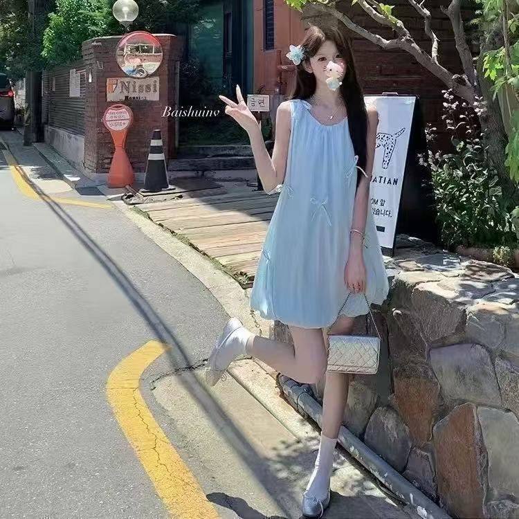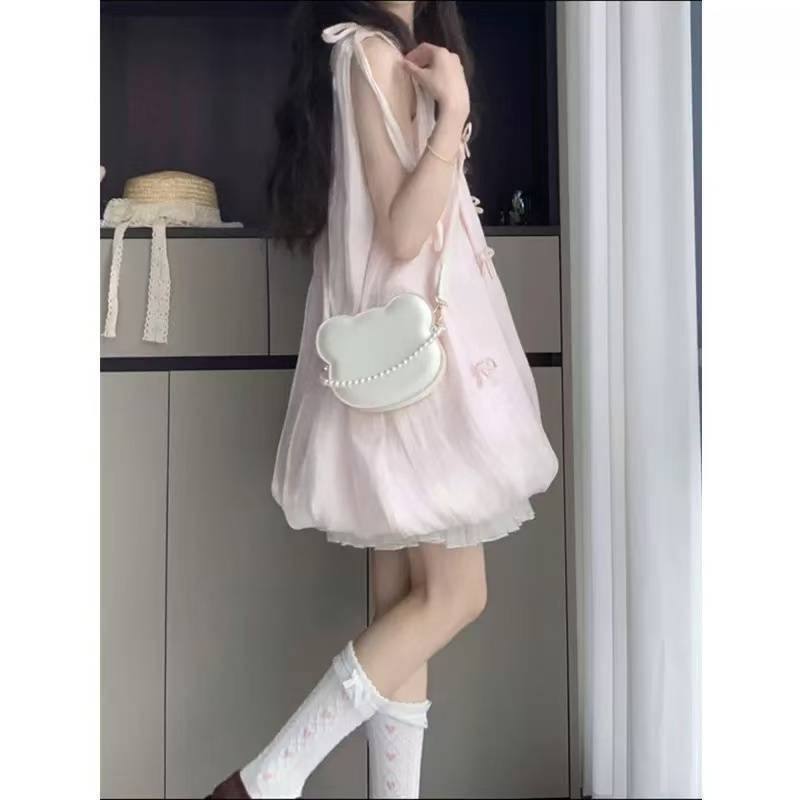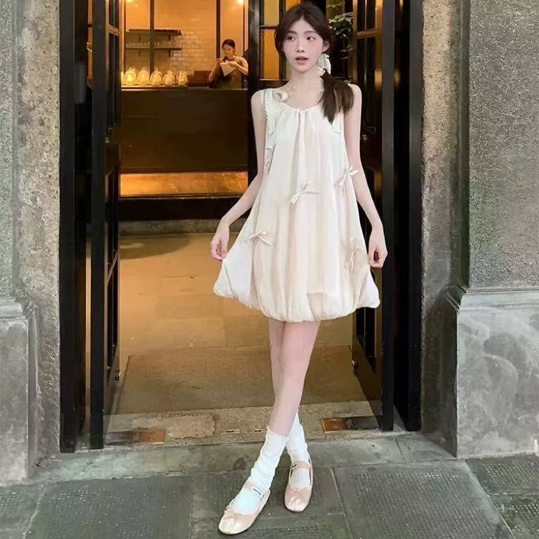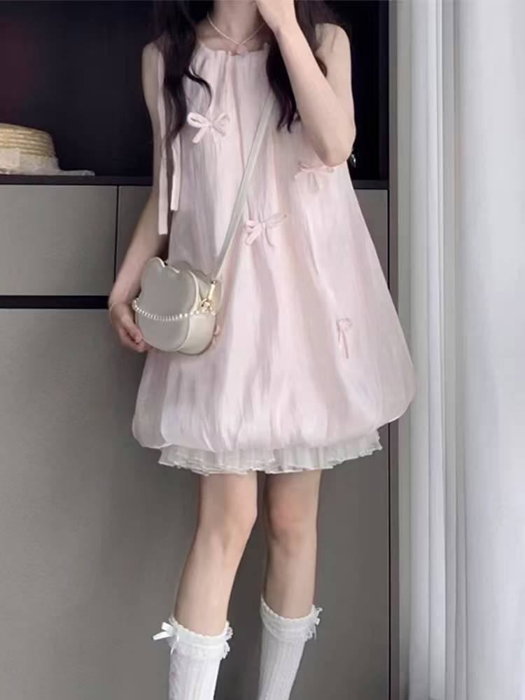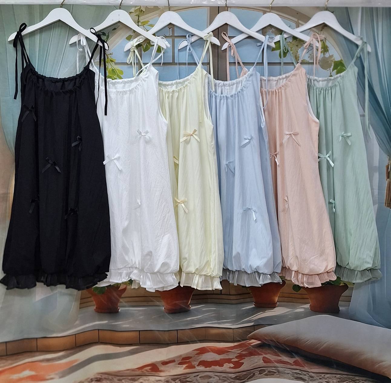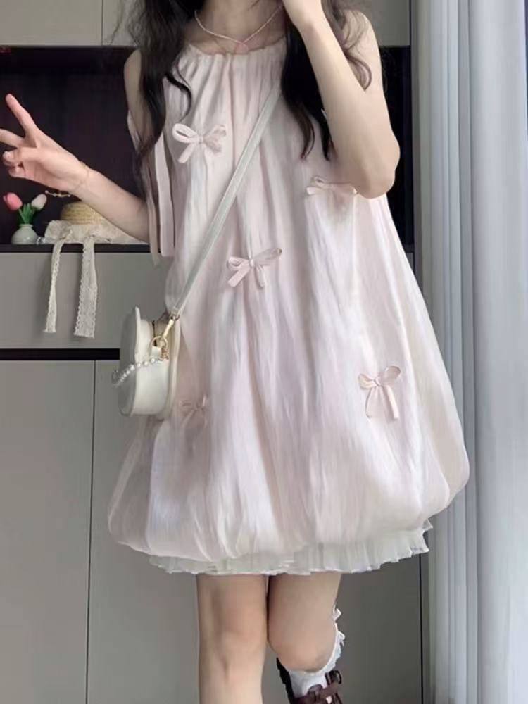 Y930 甜美蝴蝶结绑带宽松露肩花苞连衣裙